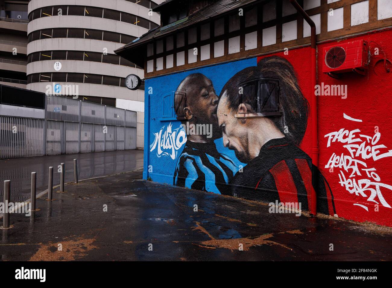 Milan Italy 11th Apr 2021 Zlatan Ibrahimovic Ac Milan And Romelu Lukaku Fc Internazionale Dispute Graffiti Outside San Siro During Inter Fc Internazionale Vs Cagliari Calcio Italian Football Serie A Match