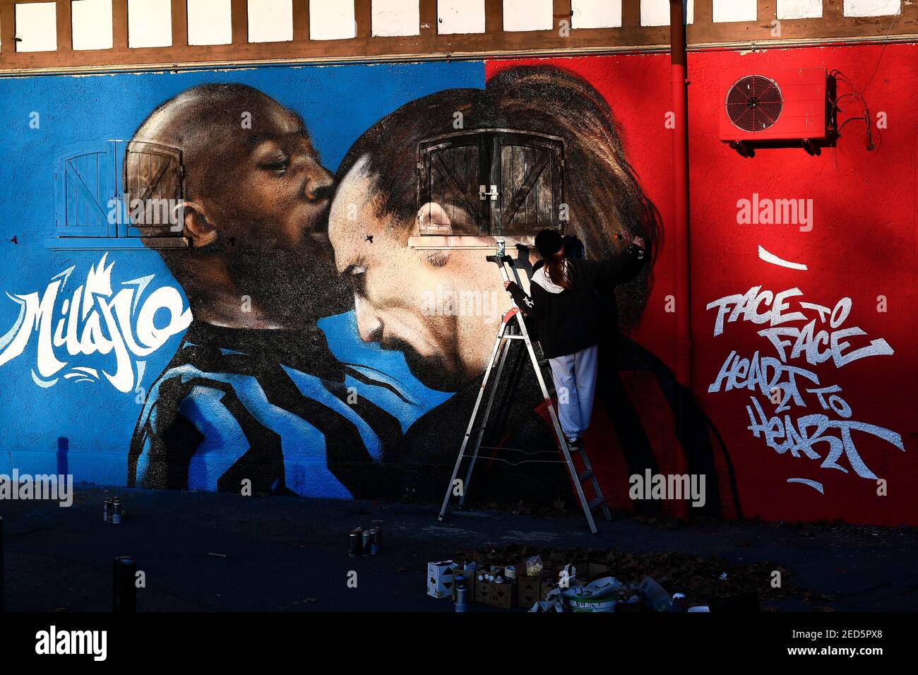 Mailand Italien 14 Februar 2021 Ein Wandgemalde Das Romelu Lukaku Vom Fc Internazionale Und Zlatan Ibrahimovic Vom Ac Mailand Darstellt Ist Vor Dem Fussballspiel Der Serie A Zwischen Dem Fc Internazionale